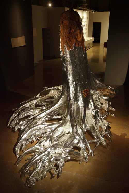El tronco y parte de sus raíces fueron sometidos a labores de limpieza y a retirada de ramas y partes en mal estado. Posteriormente consolidación de copa, lijado de cortes, lijado de texturas inconvenientes, definición de forma y volumen por último recubrir todo el tronco y raíces de aluminio en hojas 100% reciclado y con coste en producción un 95% menor que en el material convencional.