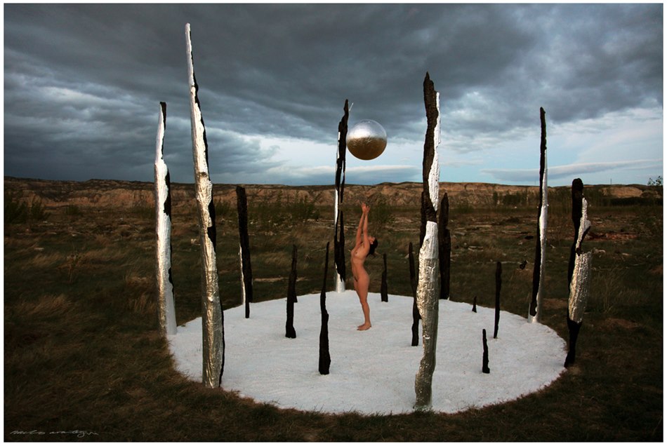 Dejándome llevar por las sensaciones, reposando las emociones, dialogando con lo que fue y lo que es, la imaginación comienza a brotar y de ahí surgen las líneas de la intervención escultórica Conscientia, que tiene 6.5m de diámetro y contiene troncos de chopos que quedaron desperdigados y medio calcinados de unos 4m de altitud el más alto.