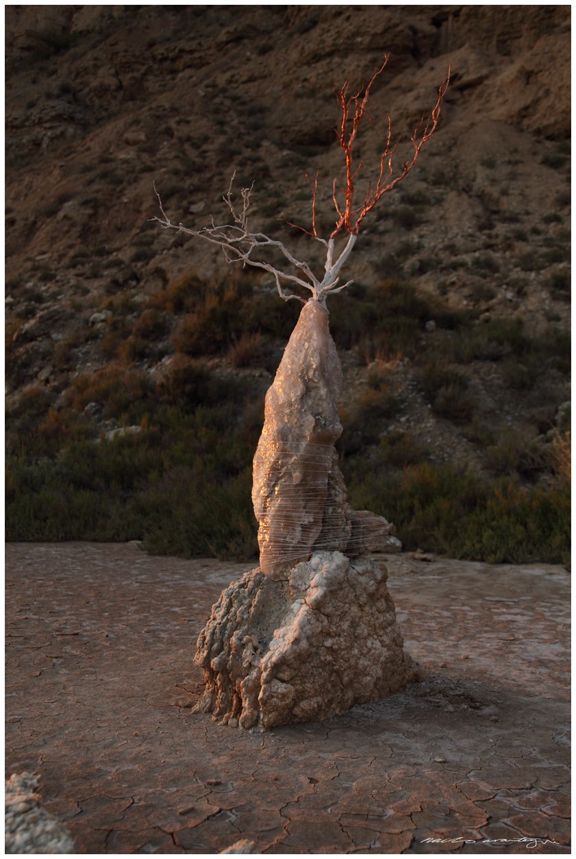 Intervención escultórica a orillas de la carretera A-126, a pocos kilómetros de Remolinos-Zaragoza. Toma los materiales que ofrece la naturaleza del lugar, piedras yesosas, sal de las salinas de la empresa Ibérica de Sales, sal de compás del interior de la mina, arbustos de romero secos tratados por diferentes procedimientos, por otra parte hilo de algodón.