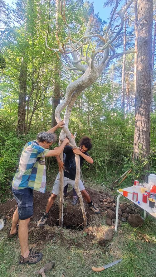 Pieza escultórica formada por una profusa serie de brazos entrelazados que miden en su conjunto: 4,30m x 1,35m x 2,50m. Proviene de una raíz de platanus x hispanica y estaba cubierta del vilano algodonoso que se desprende de los chopos en primavera. La base formada por una serie de piedras de canto rodado colocadas siguiendo una disposición, contenían algunos símbolos en tinta roja natural (óxido de hierro).