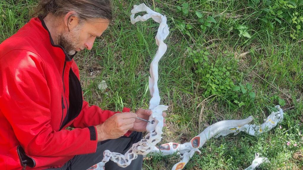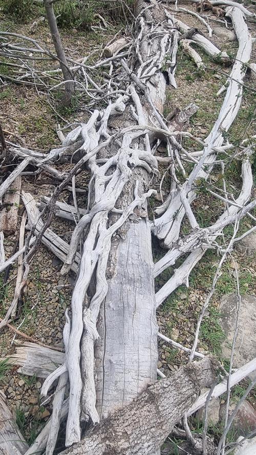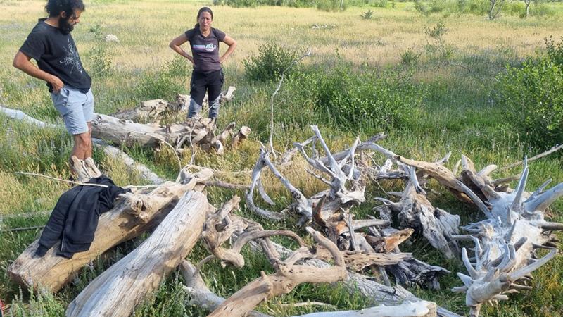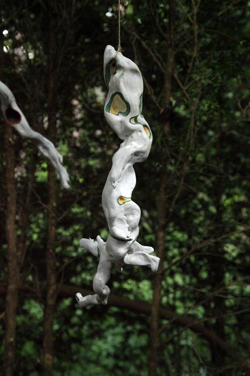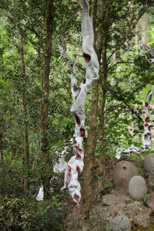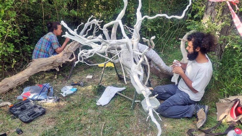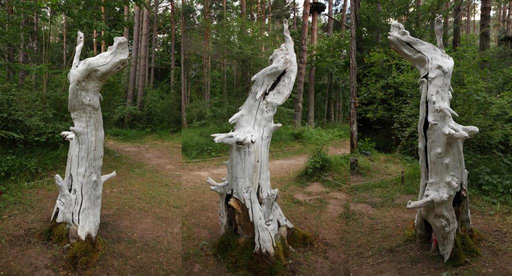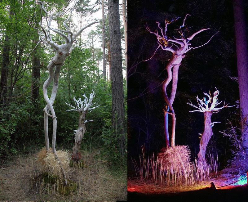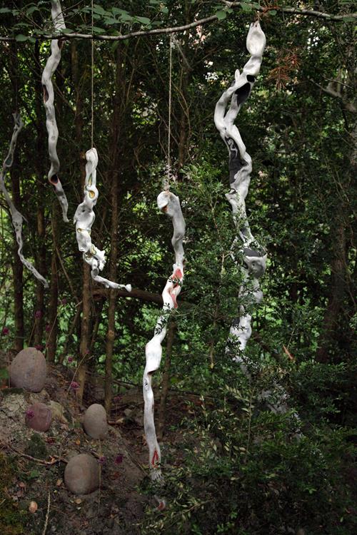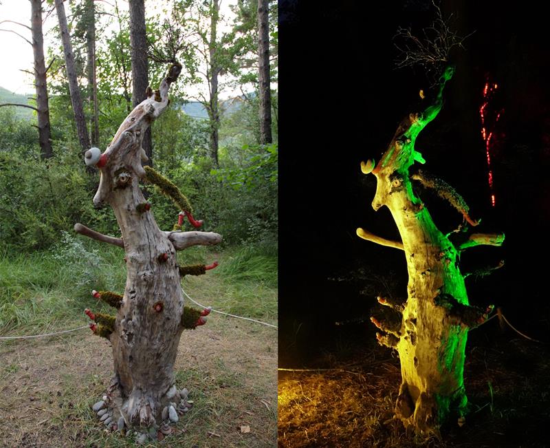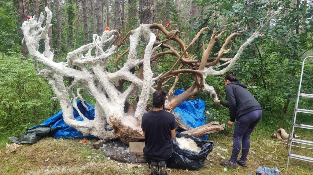 Tres piezas escultóricas formadas de troncos secos localizados a orillas de un pantano próximo a la Comarca de la Jacetania. Se cubrieron de arcilla blanca, pigmentos naturales, fijador biodegradable, musgo, piedras, falsa avena, acículas, muérdago, hojas secas.