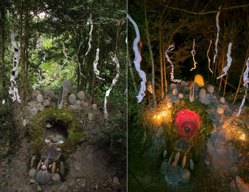Consistía en un altar ubicado en un pequeño montículo de tierra y formado por piedras de canto rodado, musgo, plantas y raíces de árbol con formas cóncavas trabajadas con caolín y pigmentos naturales biodegradables. Se publicó en las redes sociales de Trarutan una imagen del altar ofreciendo la posibilidad de que las personas que vinieran a vivir la velada, dejaran una pequeña ofrenda a las mujeres que a lo largo de la historia fueron acusadas de brujería e injustamente ajusticiadas. La interacción del público pronto propició que aparecieran en el altar diferentes objetos.