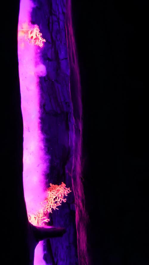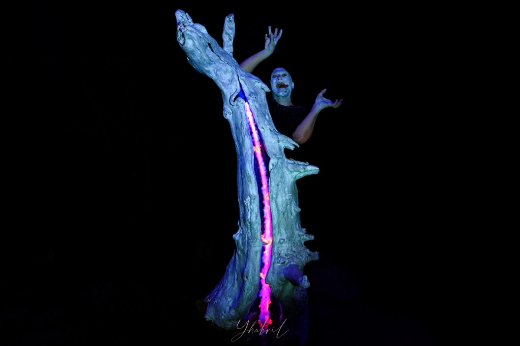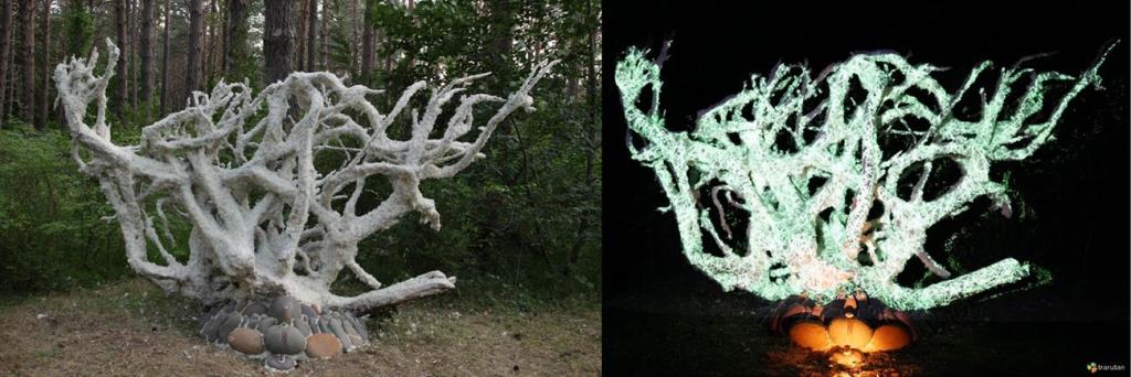 Pieza escultórica formada por un gran tronco hueco con formas sugerentes. Su base de musgo y piedra daba paso a una blanquecina piel cubierta de caolín y en su interior el grafito aportaba una oscuridad profunda y turbadora. De la tierra brotaba la médula, un nervio que recorría todo el hueco del tronco de abajo arriba y que tenía la cualidad de la fluorescencia, dejando entrever pequeñas conexiones de vibrantes estambres.