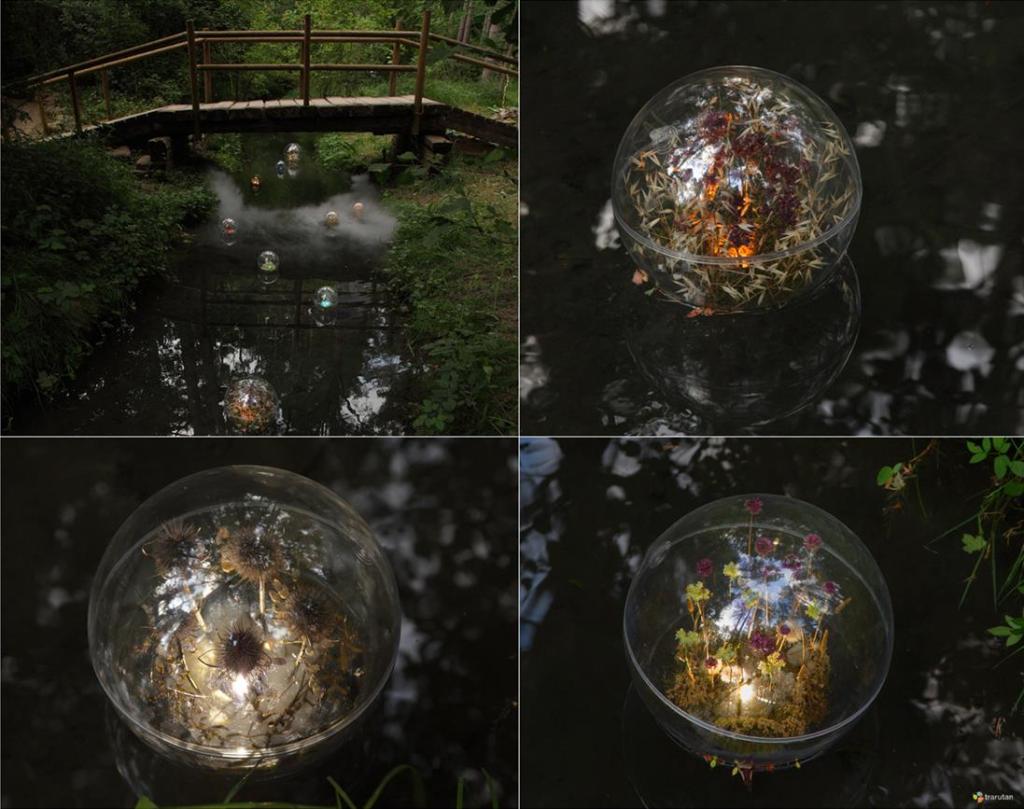 En total 10 esferas de diferentes diámetros se disponían a ambos lados del puente. La luz emanaba del interior a través de pequeños artefactos led. El vapor de agua se materializaba a través de dos aparatos generadores de niebla por difusores ultrasónicos. La pieza requería de su manipulación cada noche, había que recargar las baterías de los artefactos de luz.