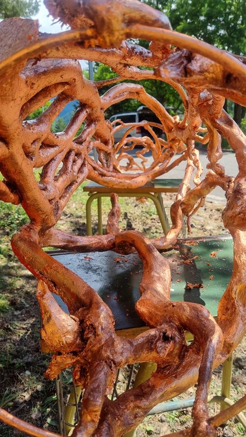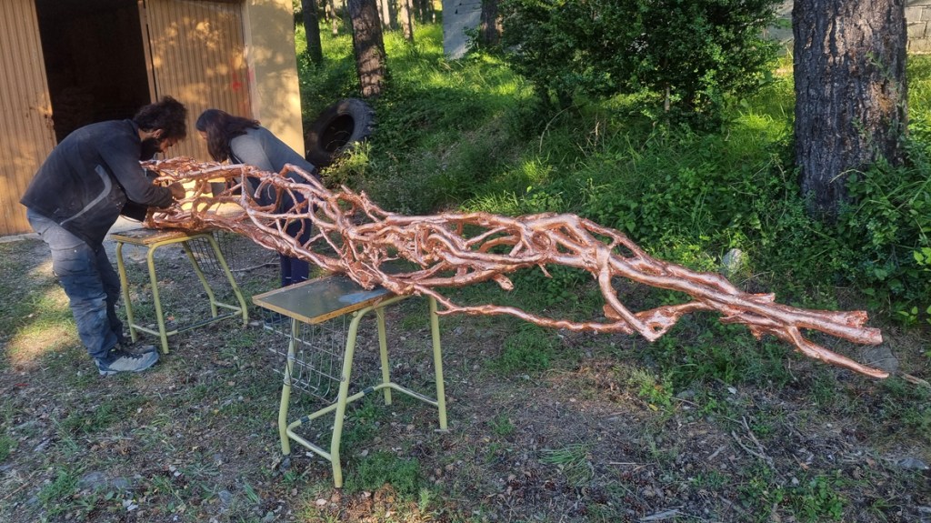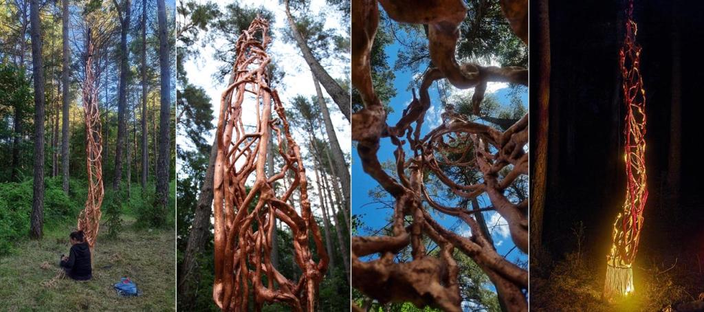 Pieza escultórica formada por una gran enredadera de 4.40m de alto que se pudo desprender de un tronco muerto. Su estructura se completó con otras ramificaciones, el conjunto se cubrió de pan de cobre.