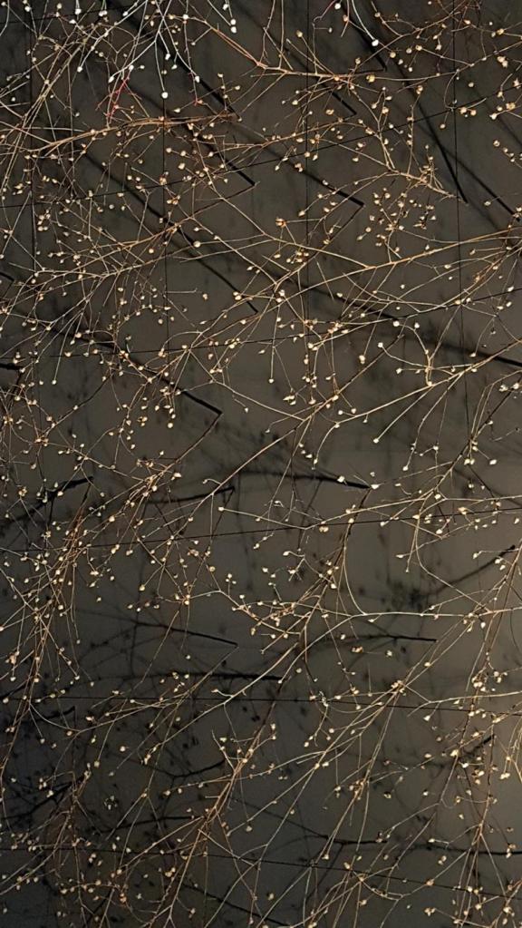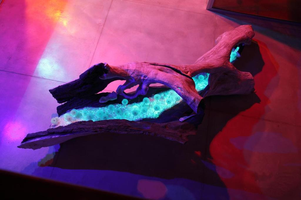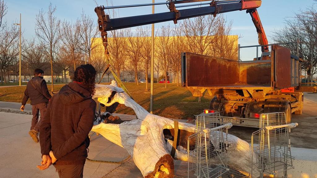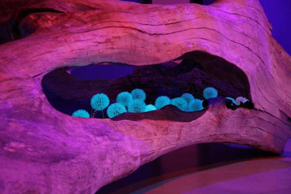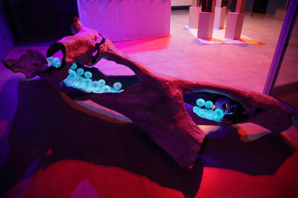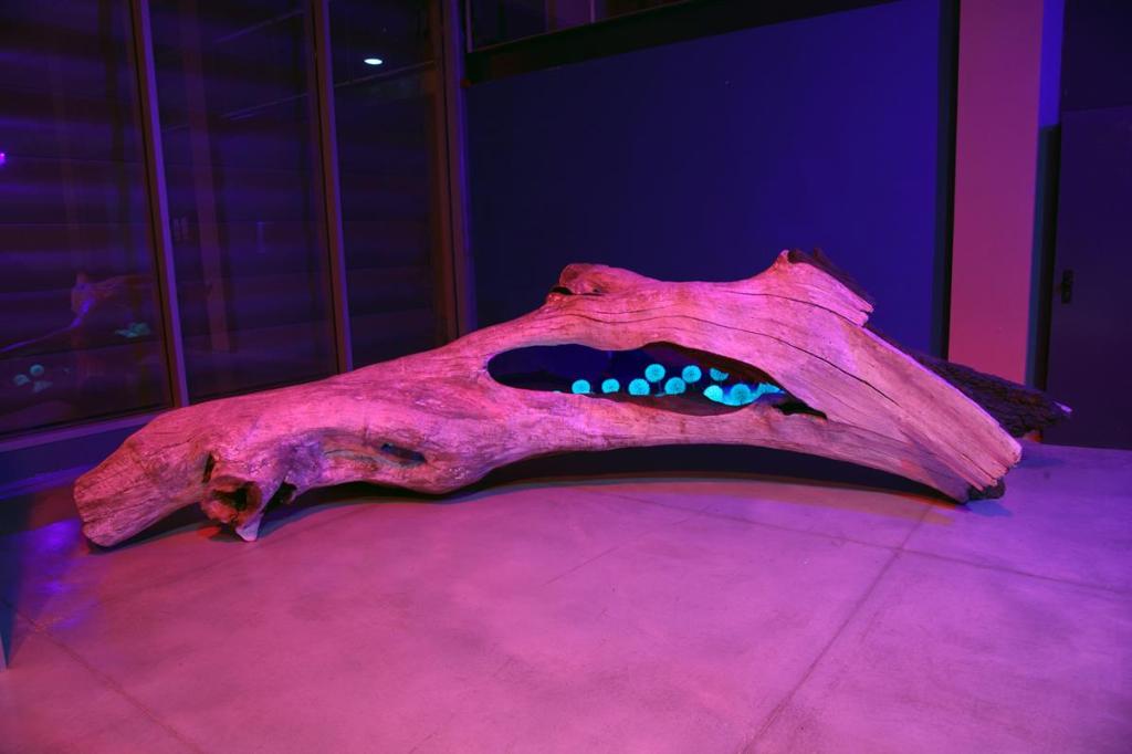 ESCULTURA ubicada en el hall del edificio CIAR, se trata de una pieza de gran tamaño formada por un tronco hueco de platanus x hispanica. La corteza exterior con imprimación de barro blanco caolín y pigmentos naturales, el interior del tronco con imprimación de grafito. La longitud del hueco del tronco cubierta de una cama de sal con tratamiento de aluminato de estroncio, sobre ella una ligera capa de vilano algodonoso de chopo. Sobresale una frondosidad de pompones Tragopogon pratensis, y entre ellos pequeños filamentos de ramitas tratadas con luminiscencia roja. La pieza está iluminada de extremo a extremo con una tira de luz led neón.