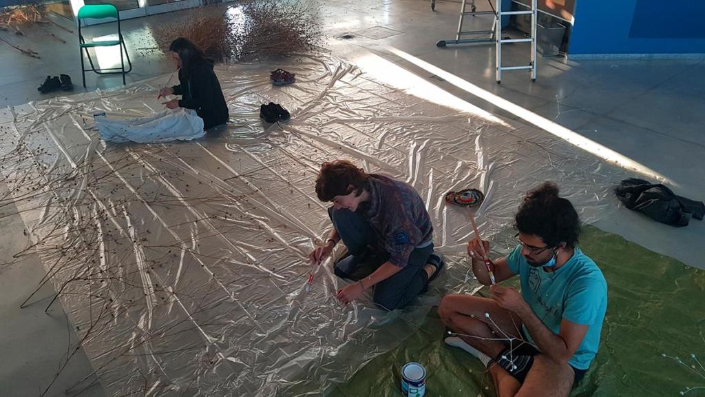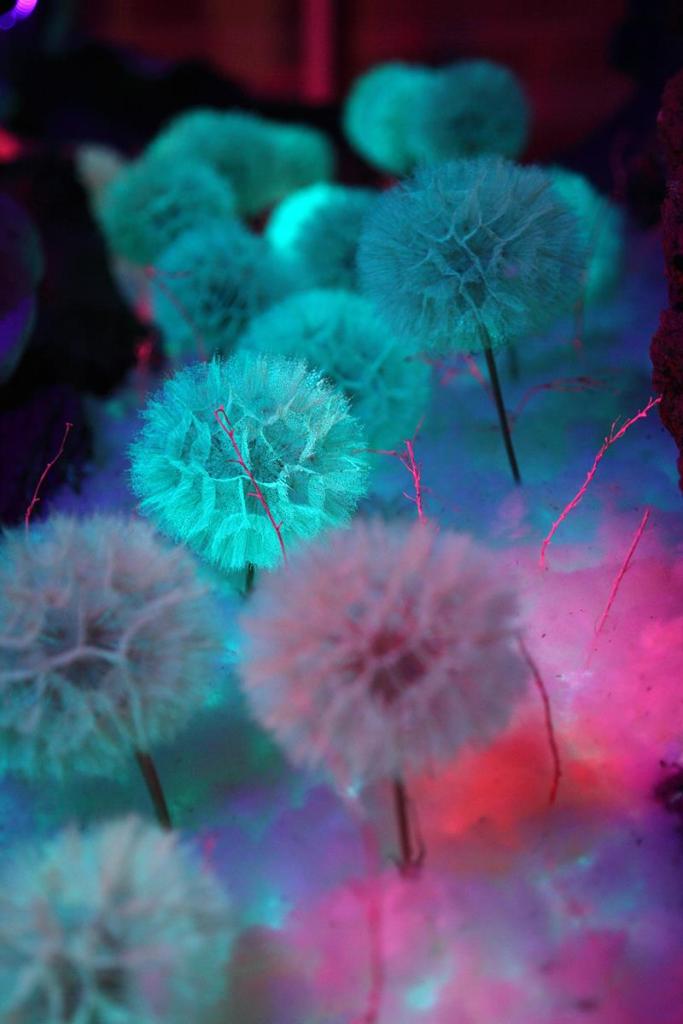 Materiales_ Mantisalca salmantica, Salvia rosmarinus, Tragopogon pratensis, vilano algodonoso de chopo, pintura luminiscente (aluminato de estroncio), pintura fluorescente roja, pintura blanca base agua, cuerda negra, bombilla luz ultravioleta.