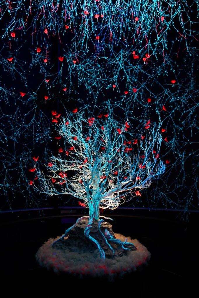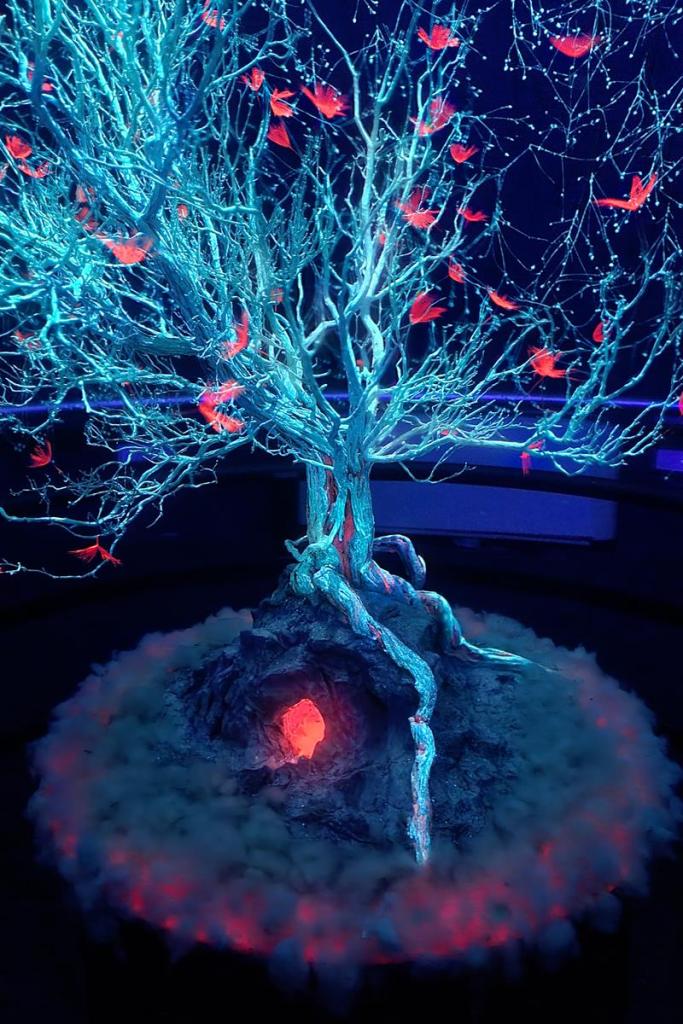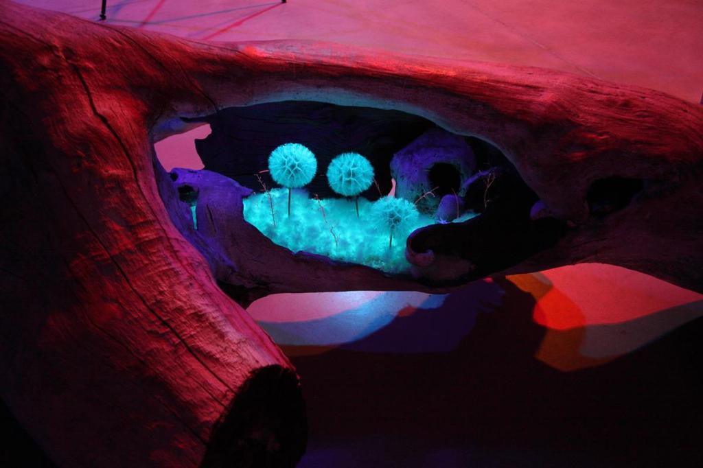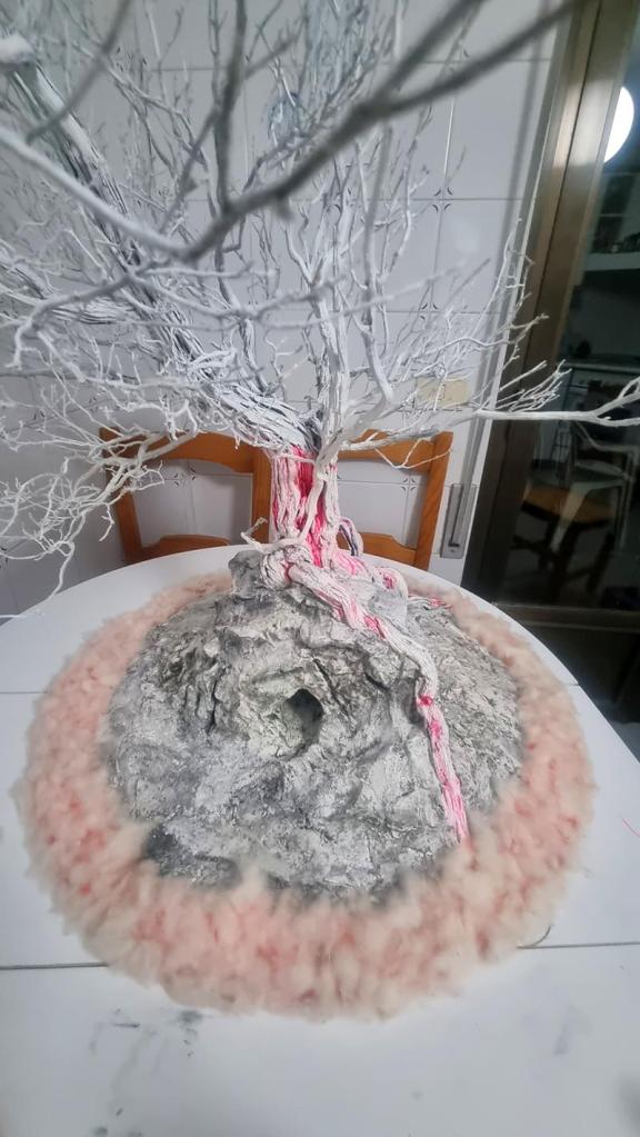 En el eje central de la sala y sobre la peana un gran romero seco tratado con imprimación luminiscente de tonalidad azul en tronco y ramas, en grietas o bajo relieves de tonalidad roja. De sus ramas, a modo de flores que se elevan hacia lo alto del silo, vilanos de Tragopogon pratensis con imprimación rojo fluorescente. La base del árbol representa un conjunto de rocas, en un costado un orificio a modo de caverna desde donde emana el flujo rojo.