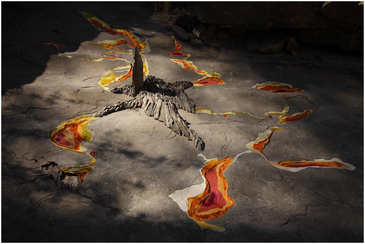 Materiales: barro blanco y pigmentos naturales biodegradables.