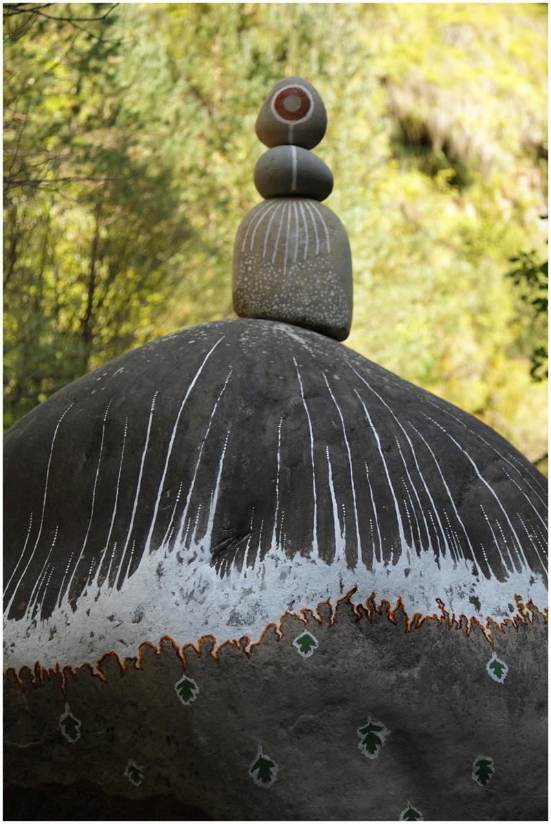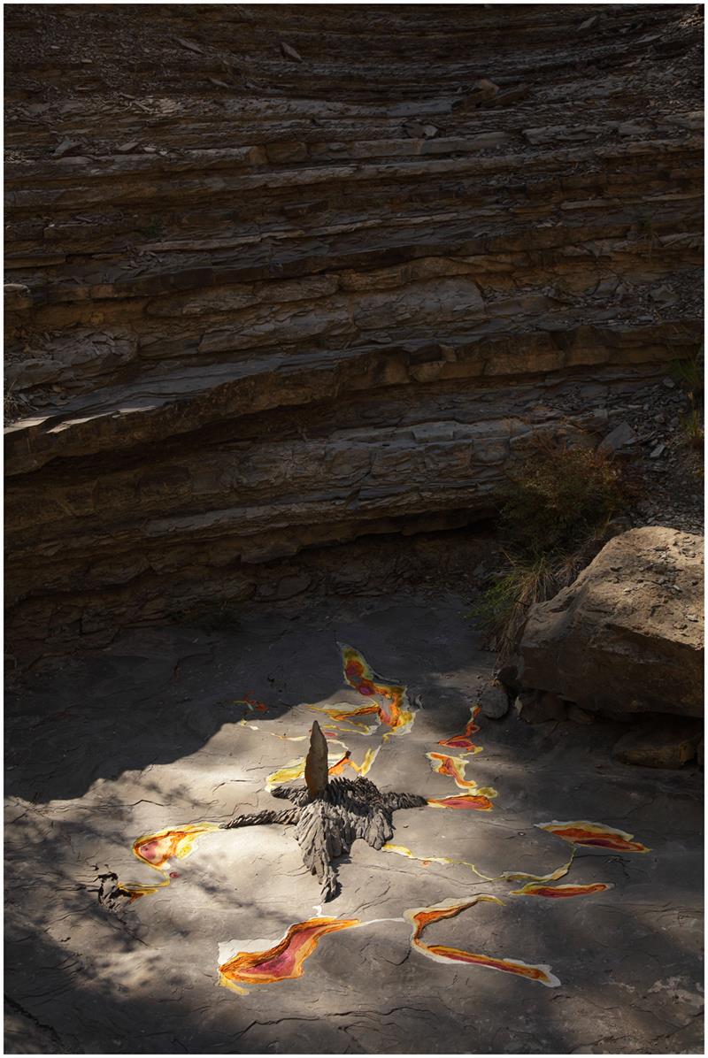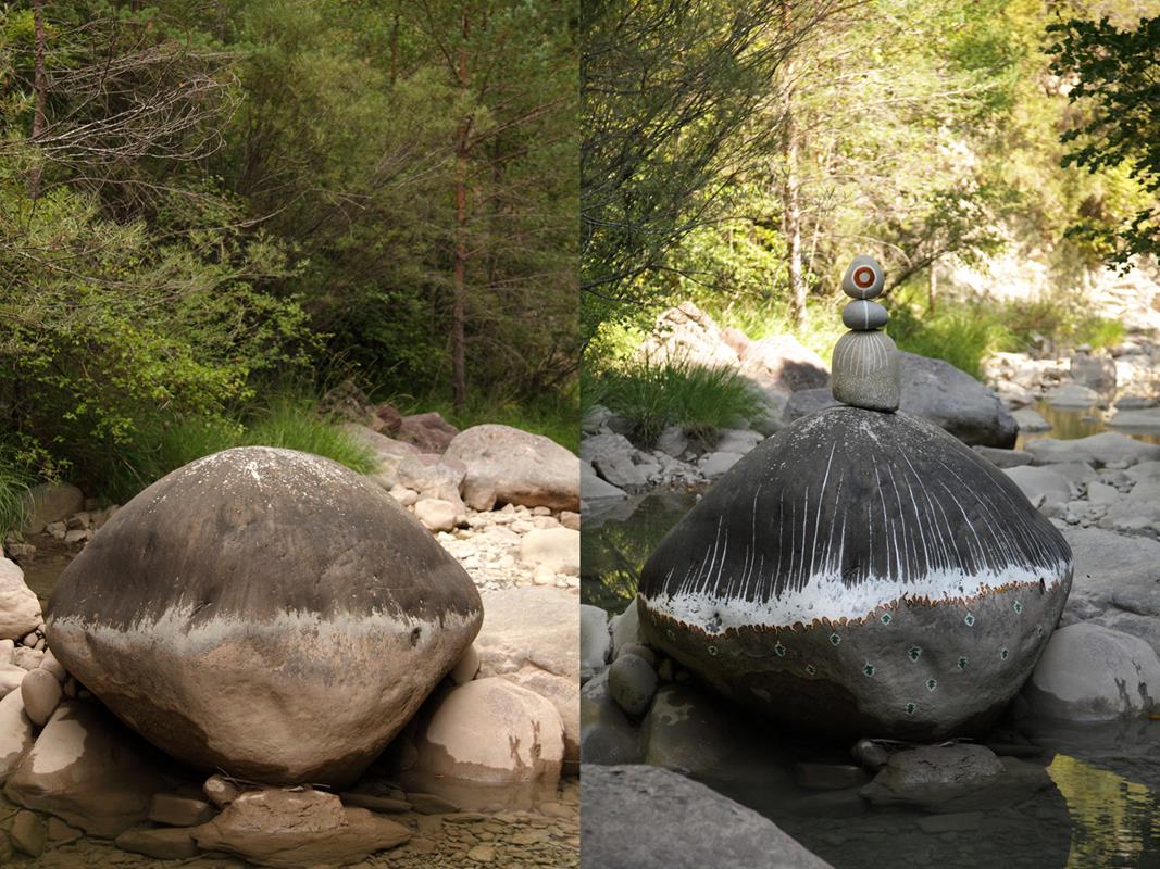 En el barranco del Hospital de Siresa me llamaron la atención los patrones o dibujos en las rocas, las marcas de los niveles del agua por ejemplo, que en esta zona contiene mucha cal, me llevaron a crear una de las piezas efímeras «MO», que saludaba al sol cada mañana.