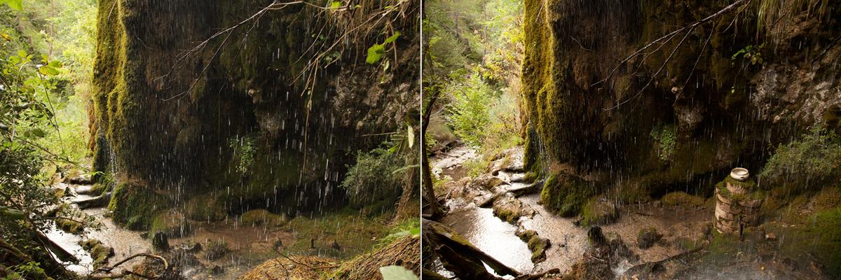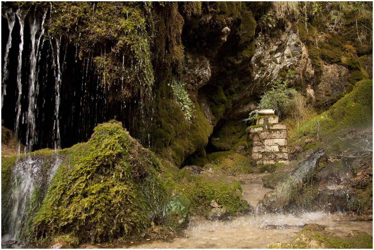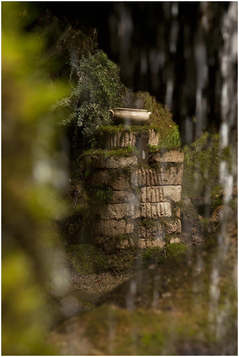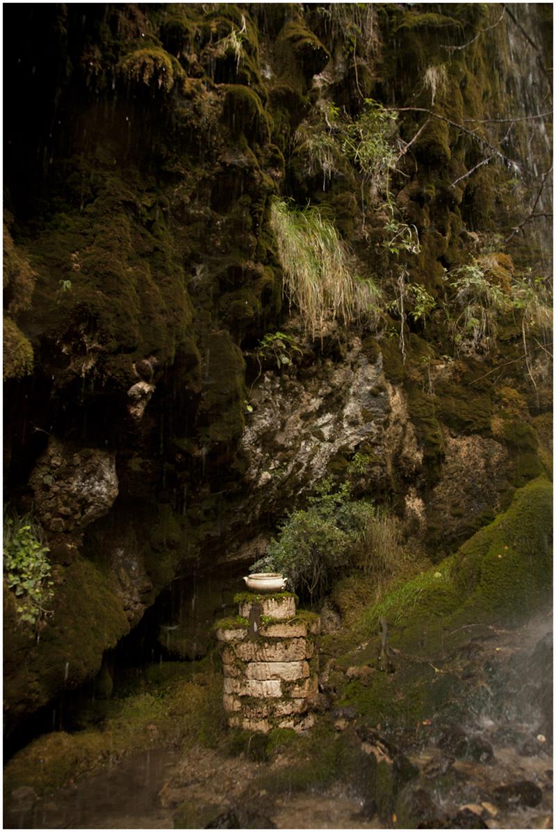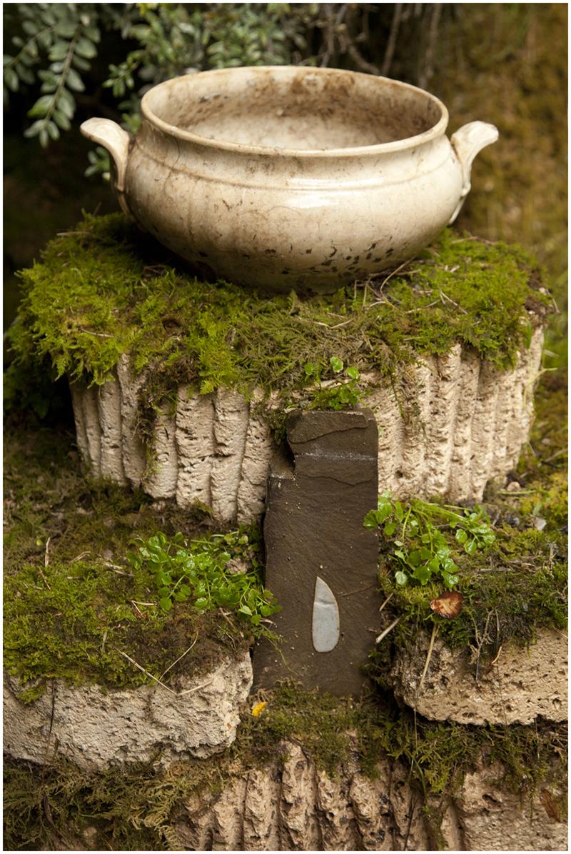 Durante la exploración del barranco encontré un espacio que me hechizó, uno de esos lugares en los que se percibe la morada de los seres feéricos. Un recoveco poco accesible al que se llega trepando desde el lecho del río, descubre paredes con protuberancias de vibrante musgo y plantas de agua alimentadas por una constante y sonora cortina de agua. La contemplación de aquel mágico lugar pronto mostró una cara que me dejó contrariado, había todo tipo de basura esparcida, me llamó la atención el sonido del agua que al caer golpeaba en un plástico negro incrustado en la tierra, también la piernita de una muñeca de plástico color carne que emergía del musgo. Seguí mirando con detenimiento, un antiguo somier de malla metálica oxidada, cristales, botellas de plástico, materia orgánica propia de restos de huerta… Cuanto más ascendía por aquel paraje más basura y escombro encontraba, me llamó la atención un antiguo cuenco de cerámica semienterrado, lo tomé y me sorprendió por su belleza y buen estado.